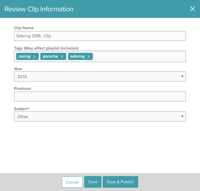 - 檢閱剪輯片段資訊。您可以編輯剪輯片段名稱、標籤和為帳號建立的任何自訂欄位。