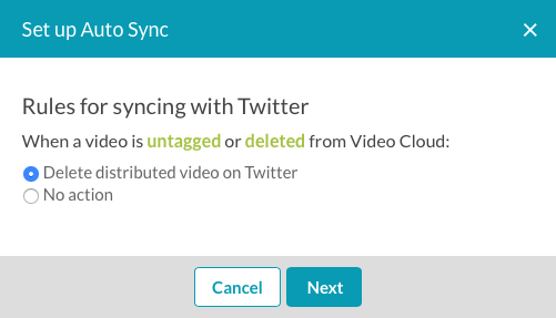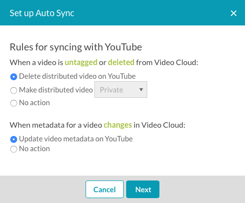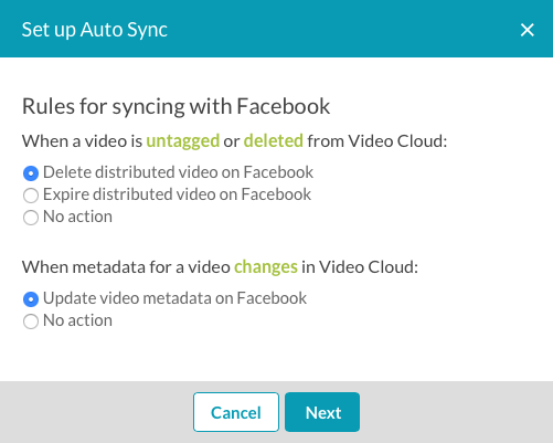 設定自動同步時,您可以設定規則來處理社交媒體網站上的視訊會發生什麼情況。這包括從清單中移除視訊 (視訊已從 Video Cloud 刪除或標籤變更) 或處理視訊中繼資料更新的方式。這些規則是根據所選擇的社交媒體平台而定: